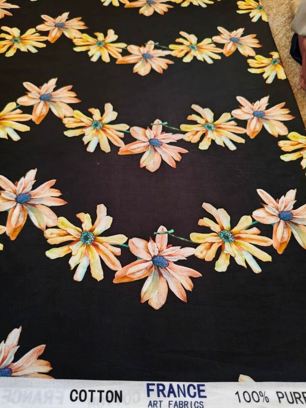 Tissu 100% coton fond noir imprimé floral orange et blanc